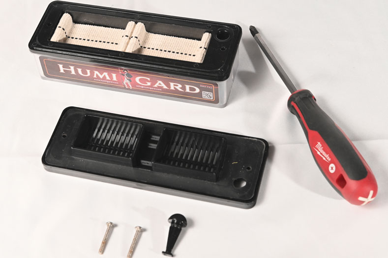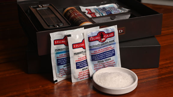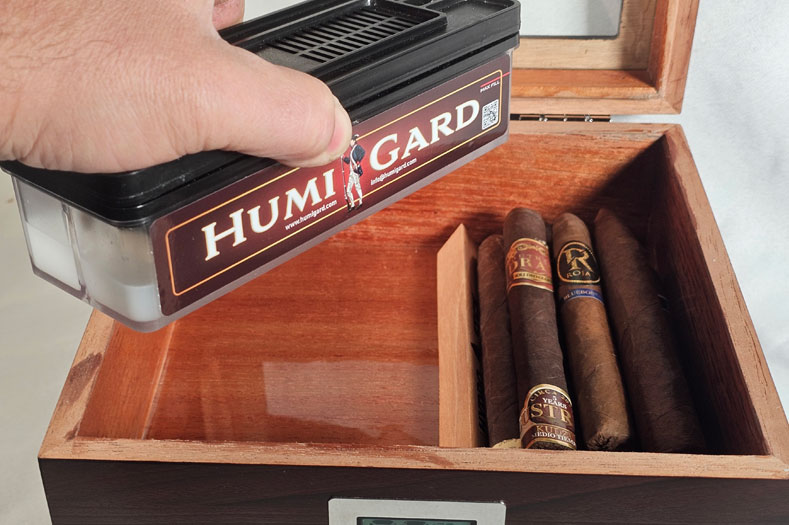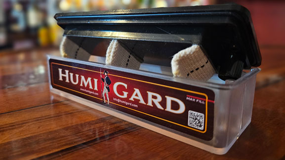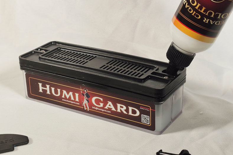 Anyone who has a humidor or stores cigars is familiar with the humidity packets that are sold all over the world. These disposable packets control evaporation using a combination of salts. The reason they are so popular is because they are very accurate. The downside, they don’t hold a lot of fluid. You have to buy them over and over again. Humigard uses the same concept to get the accuracy, but the unit continuously recharges the paste, using a wick that moves the water from the storage chamber. Thus, giving you the best of both worlds. The accuracy of the packets with the longevity of the electronic units that hold large amounts of fluid.