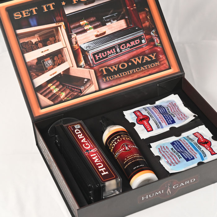 COMING SOON!!!! The Humigard Starter Kit comes with everything you need to protect your cigars long term. It comes with one Humigard Unit, one 8 OZ. bottle of our Cedar Cigar Solution, one trowel and a variety pack of our Humidity Control Paste, which includes 4 different levels of humidity control and one Calibration packet. EMAIL US AT: info@humigard.com AND WE WILL CONTACT YOU WHEN THEY ARE READY FOR PURCHASE!